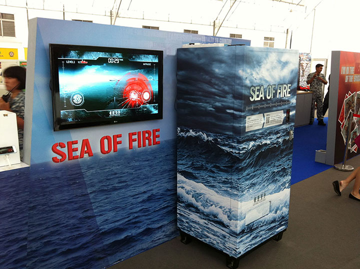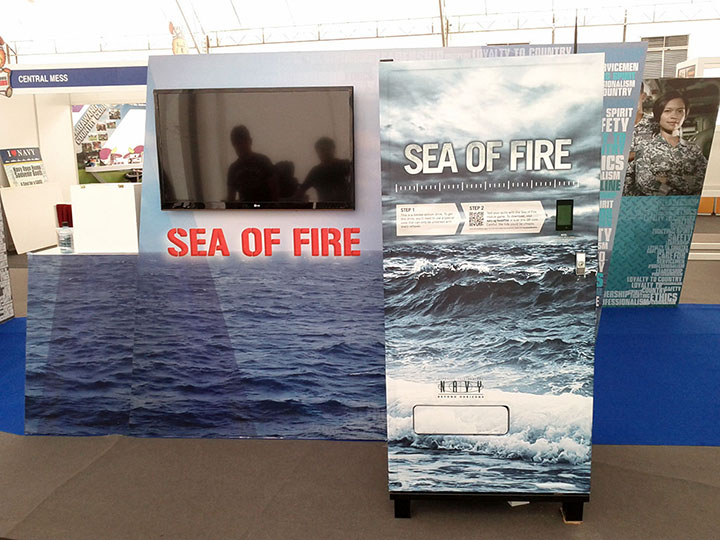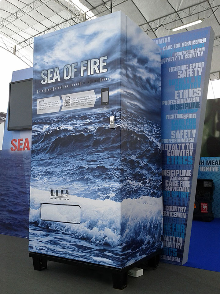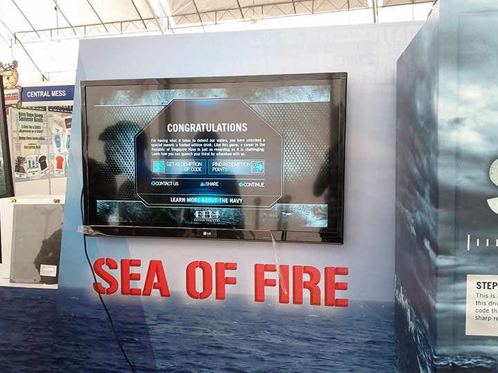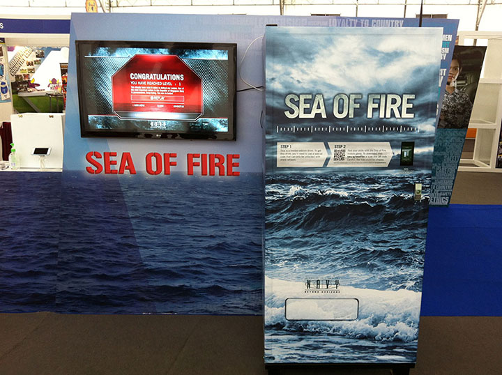 A set of Vending Machines were customised for the Singapore Navy to allow users to redeem limited edition drinks by playing a game on their smartphones, and getting them to redeem a free drink by presenting their QR Redemption coupon via mobile phone. The VMs were first deployed at the Changi Naval Base Open House and later to the Temasek Polytechnic where students could download a customised game onto their phone, achieve a high score, and redeem this for a drink in real time.